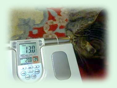 飼い猫のクーは何事が起きたのかと体重計のそばに来て匂いを嗅いでいました。
