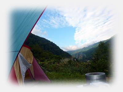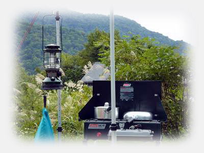 テーブルに椅子、ポールにエアーマット、調理用のストーブとスタンドに食器類、、、