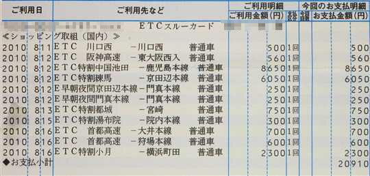 8月の九州へ行った時のETC利用料金の明細が届きました。