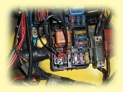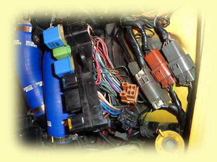 この二つともメインハーネスの太い束のままフロント左にあるリレー・ヒューズボックスまで向かっているので