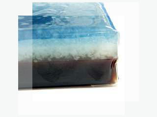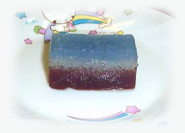 上の青と白の二層が※道明寺羹(どうみょうじかん)で下が甘さ控えめの練羊羹。