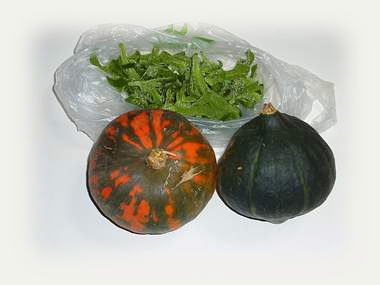 珍しい色合いのかぼちゃが二種類と緑葉(初めて目にするもので名前は分かりません)です。