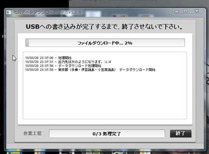 3か所をダウンロードしたのですが結構時間がかかり作業工程の欄が変化していかないので1時間以上放っておいたらやっと終了しました。