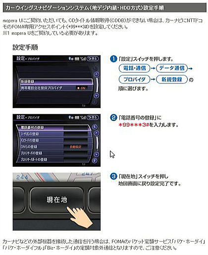 カーナビのカーウイングスがドコモの携帯経由で(Mopera U契約済みでも)つながらなかったのですが