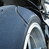 二輪のタイヤのショルダー部分はいかにもエッジという感じで
