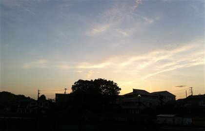 夕方には秋のように空は高くなり、ひこうき雲が夕日に輝いていました。