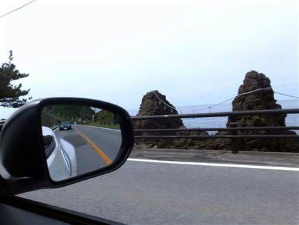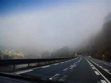 霧の中は霧雨の時のようにすぐにびっしょりに、、メガネは水滴で見えなくなり車はワイパーを回していました。
