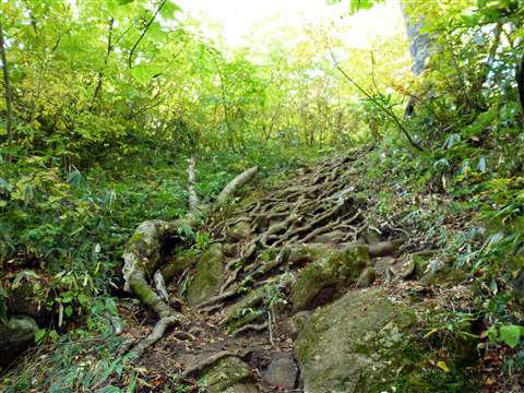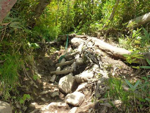 足を乗せる岩や根っこでブレーキをかけながら降りて行けば良いのですが