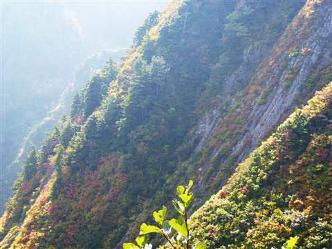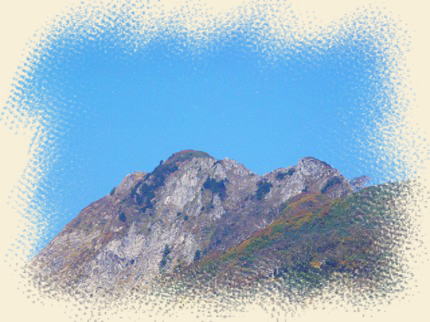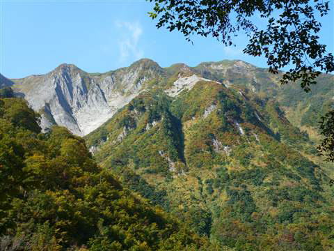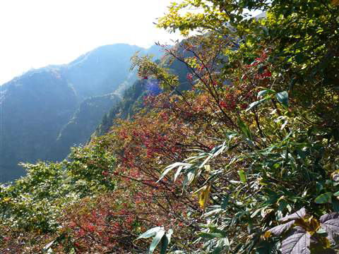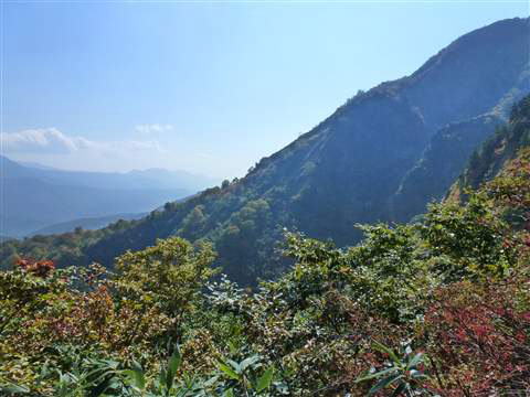 前方に立ちはだかる赤く色づいている山の稜線右側をやはりズームアップしてみると