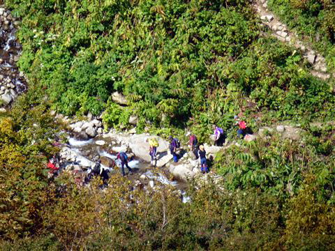 上からカメラのズームを最大に利かせると登山者が沢を渡っているのが見えました。