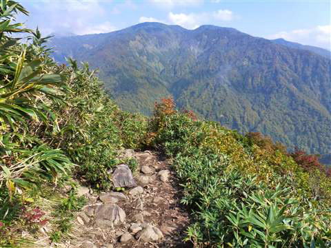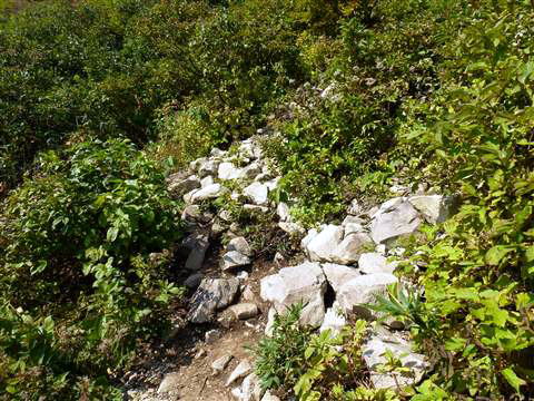 ここからは急傾斜、岩場、ガレ場、ブッシュの連続で