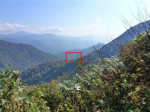 山頂方面へ向かうのには下方に見える沢からあそこまでは登らなければならないわけで結構愕然としました。