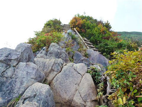 前方にはもはや岩登りとしか思えないような険しく狭い登山道が続いています。