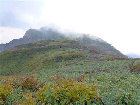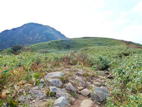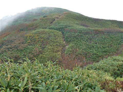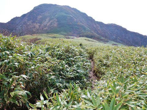 背丈ほどあるクマザサの向こうに目指す山頂が見えますが