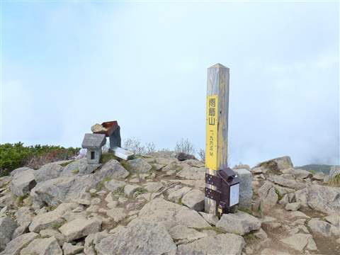 山頂を表す棒標の下に登山道維持の為の鉄製募金箱がありました。