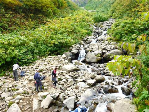 先程の沢までやっと下り着き、沢は飛び石を利用して渡れそうな事を確認しました。