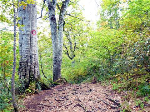 行きのブナ平を抜けて根っこに足を滑らせないように、、、