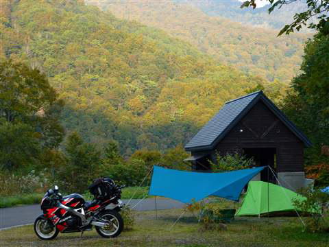 登山口でもある雨飾高原キャンプ場のオートサイトでテントとタープを張っておき、