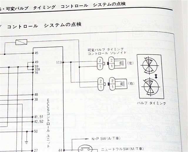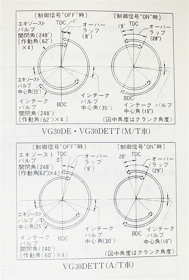 可変バルブタイミングコントロールシステム(NVCS)と当時は言われていましたが 現在のVVELなどの作動角、リフト量を自在に操れる高度な制御に比べると インテーク側のカムシャフトの位相を変化させるだけのかなり簡単なシステムです。 角度の変化量も可変ではなく20°アドバンス方向にくるっと回るだけなので エキゾースト側とのオーバーラップの作動角度は確かに増えるかも知れませんが インテークバルブの開き始めも遅くなるという中庸なシステムになっています。 純正のNVCS動作はエンジンが1500回転〜6500回転の間の一定の条件で動作しますが 条件としてスロットル開度、空気流入量、エンジン温度などから高負荷になった時に 動作するようになっていますがシフトアップなどでスロットルゆるめた時などにも 動作が解除されるようになっていて再び動作するまでのタイムラグがあるという事です。 Z32が発売された90年代初頭のチューニングショップのRSヤマモトさんがZ32のブーストアップなどをしても