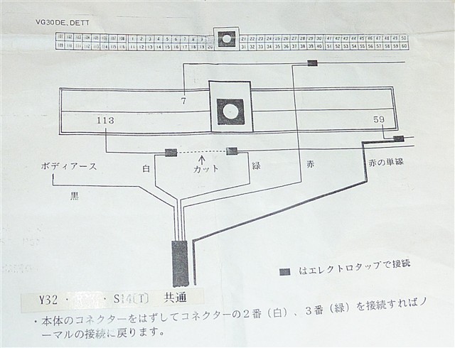 V.T.Cコントローラーの取り付け図を見てみるとECUの配線にエレクトロタップを使って 結線するという接触不良を起こしそうな取り付けの仕方です。 この事もありこのコントローラーの取り付けには躊躇していたのですが、、、 ただ7番はタコのピックアップ出力、59番はイグニション電源なので 今回実際にECUのカプラー付近から結線しコントローラーに引き込むのは 113番の赤のリード線だけで済みそうです。 |