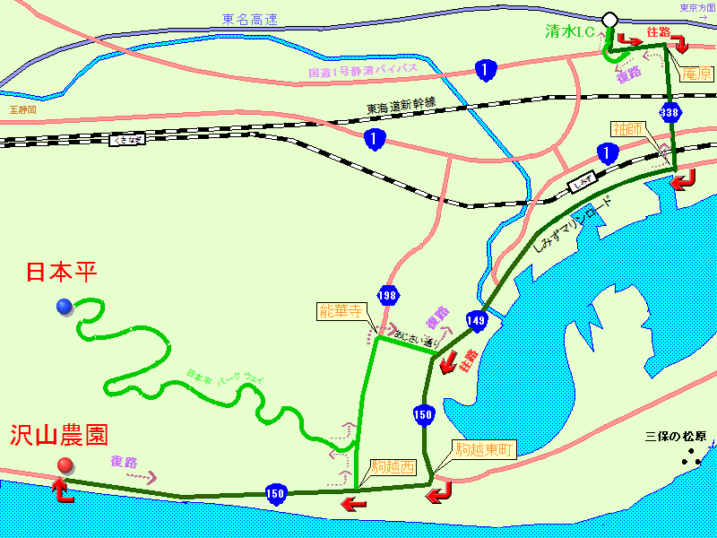 | 日本平午後3時出発⇒清水日本平パークウェイを下り⇒県道198号を清水駅・東名清水方面へ左折〜約1.2Km⇒能華寺右折(東名清水方面) |