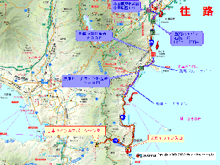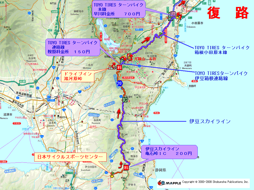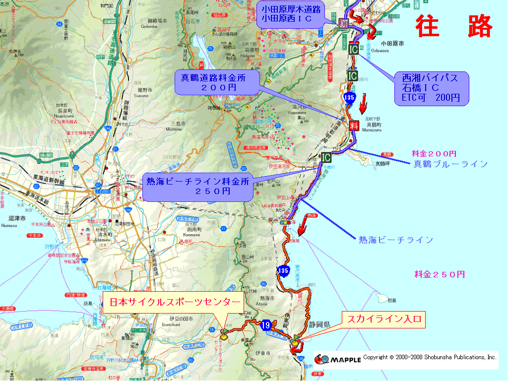 | ※ETC未対応の有料道路を利用予定ですので小銭の用意をお願いいたします。(ターンパイクはIBA登録車載器以外は使えません) 東京方面へ向かう復路の伊豆スカイライン〜ターンパイク連絡線〜ターンパイク〜小田原厚木道路の各有料道路間は 一般道路が連絡道路になりますので出発前に地図の確認をお願いいたします。 |