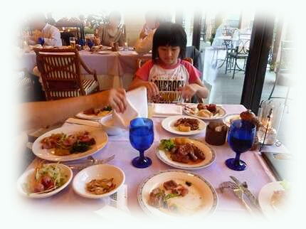 夕食はホテルならではの景色の見えるテラス脇で、、