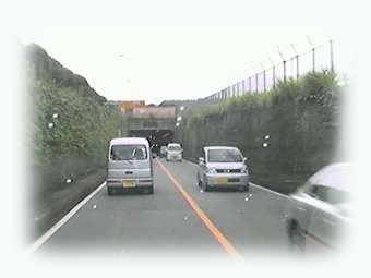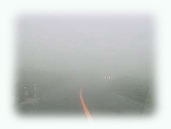 これはひょっとするとと考えているうちに霧の中へ入りみるみるうちに視界が悪くなり前の車のテールライトがかろうじて見える程度になってしまいました。