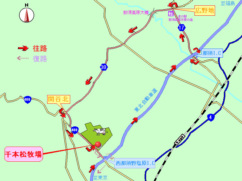 | 広野地左折⇒県道30号(矢板那須線)〜那須高原大橋〜15.3km先、関谷北を左折 |